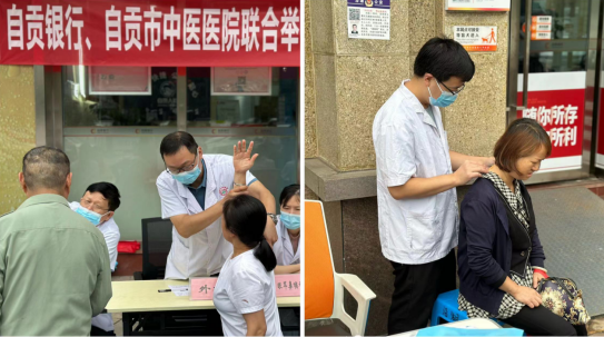 自贡市中医医院的志愿者医生们为来到银行的客户提供了免费的多科室就诊登记、问诊、测量血压、中医适宜技术体验、针灸推拿等服务,向在场的客户科普了常见慢性病、多发病的预防和治疗等健康知识,并对大家提出的问题进行了耐心解答。